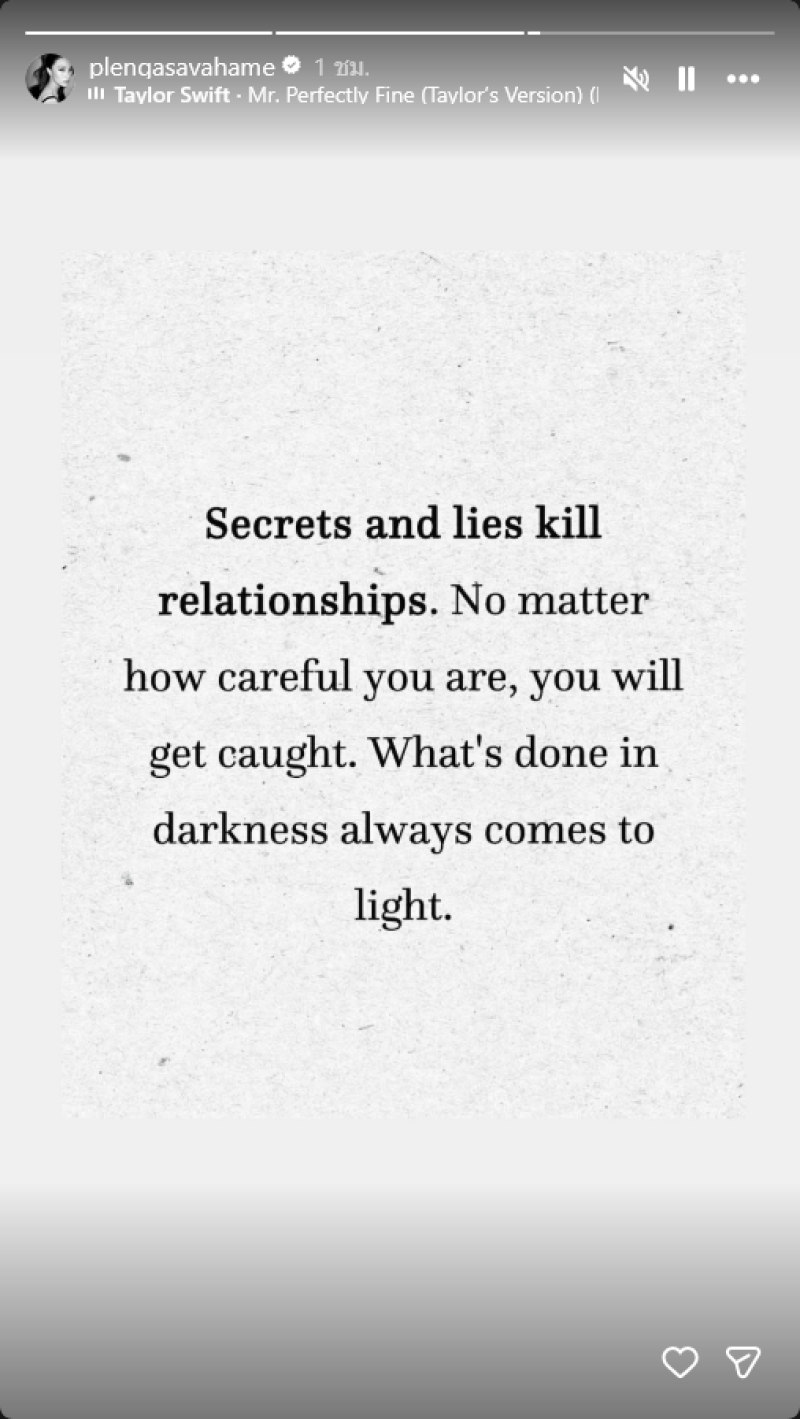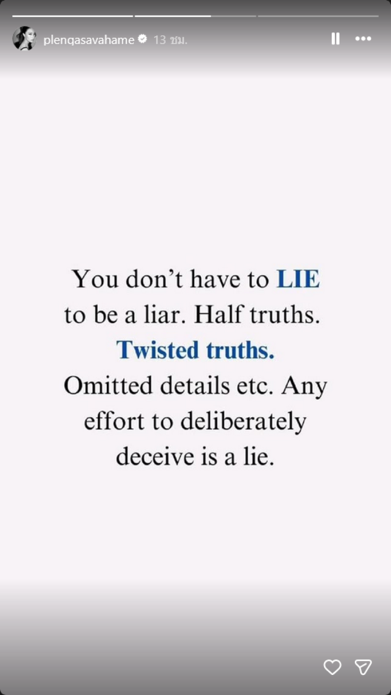 ล่าสุด เพลง ชนม์ทิดา ได้แชร์ไอจีสตอรี่ที่เป็นเนื้อหาเกี่ยวกับการโกหก และความสัมพันธ์ว่า