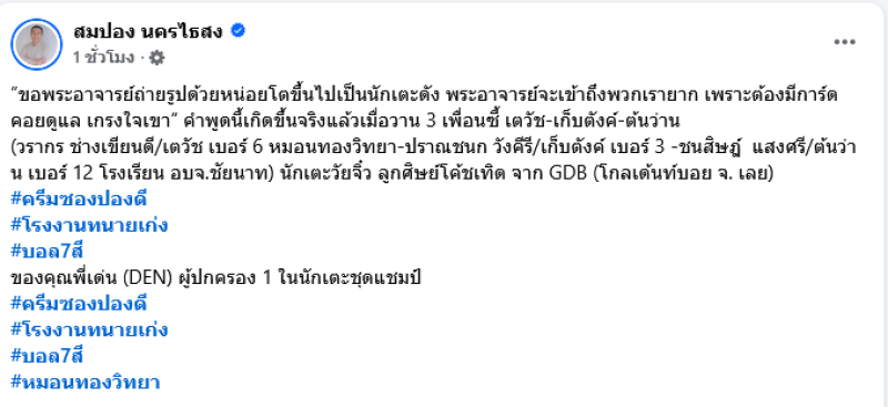 ล่าสุด สมปอง นครไธสง ได้ออกมาโพสต์ภาพเมื่อหลายปีก่อน ขณะบวช กับนักเตะวัยจิ๋ว ซึ่งกลายเป็นไวรัลสนั่นโซเชียลกับ หมอนทองวิทยาเเละอบจ.ชัยนาท พร้อมเขียนแคปชั่นระบุว่า ขอพระอาจารย์ถ่ายรูปด้วยหน่อยโตขึ้นไปเป็นนักเตะดัง พระอาจารย์จะเข้าถึงพวกเรายาก เพราะต้องมีการ์ดคอยดูแล เกรงใจเขา