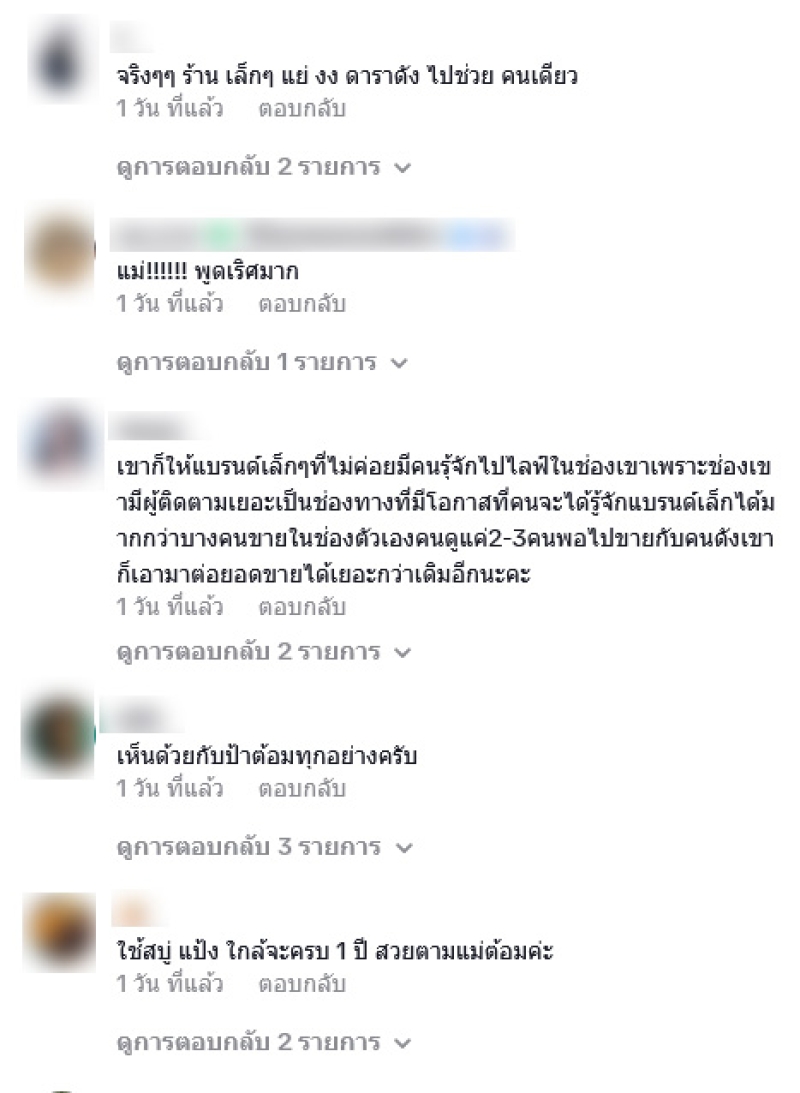 บางทีก็งงเค้าไม่มีของดีกันหรอ เค้าไม่มีช่องเป็นของตัวเองหรอ ไปส่งเสิรมให้คนๆนึงรวยมาก ซื้อบ้านซื้อรถแจก แม่ไม่ไปหรอกเรามีต้นทุนเป็นดารานักแสดง เราช่วยเอฟซีเราให้ได้ใช้ของดีๆราคาหลักร้อย โดยมีหลายคนต่างเข้ามาคอมเมนต์เห็นด้วยกันอย่างมาก