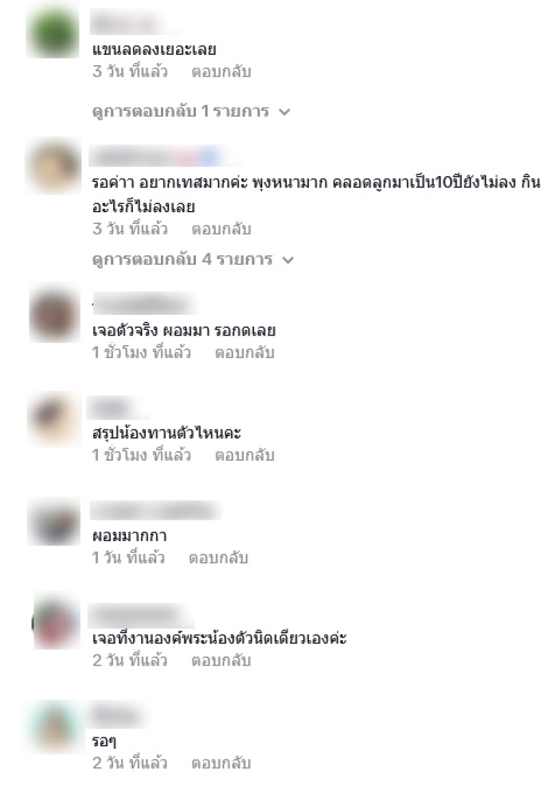 ท่ามกลางแฟนๆต่างเข้ามาคอมเมนต์อย่างมาก อาทิ แขนลดลงเยอะเลย,รอค่าา อยากเทสมากค่ะ พุงหนามาก คลอดลูกมาเป็น10ปียังไม่ลง กินอะไรก็ไม่ลงเลย,เจอตัวจริง ผอมมาก,เจอที่งานองค์พระน้องตัวนิดเดียวเองค่ะ,หู้ยร่างทองกลับมาแล้วค่ะ,หู้ยลดลงเยอะเลยค่ะ