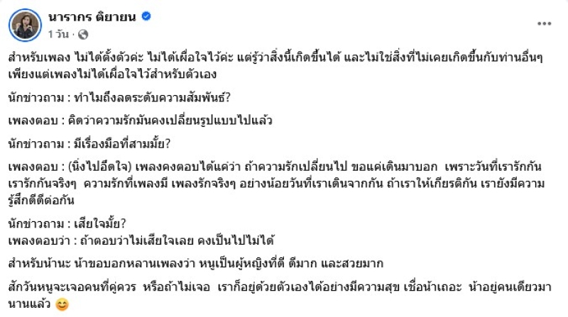 ล่าสุด ทาง พิธีกรดัง ต๊ะ - นารากร ติยายน โพสต์เฟซบุ๊ก นารากร ติยายน แสดงความเห็นบอกว่า "สำหรับเพลง ไม่ได้ตั้งตัวค่ะ ไม่ได้เผื่อใจไว้ค่ะ แต่รู้ว่าสิ่งนี้เกิดขึ้นได้ และไม่ใช่สิ่งที่ไม่เคยเกิดขึ้นกับท่านอื่นๆ เพียงแต่เพลงไม่ได้เผื่อใจไว้สำหรับตัวเอง