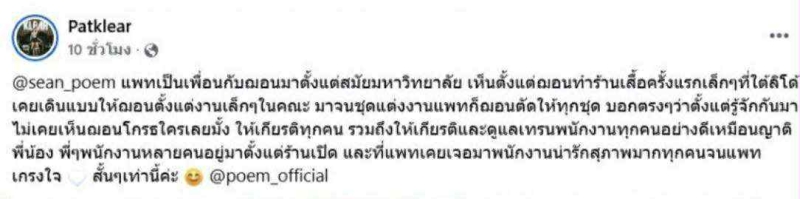 ล่าสุด แพท วงเคลียร์ นักร้องนำวง Klear และเพื่อนสนิทของฌอน ออกมาโพสต์ข้อความผ่านโซเชียลส่วนตัว เพื่อยืนยันภาพลักษณ์ และ นิสัยจริงของเขา