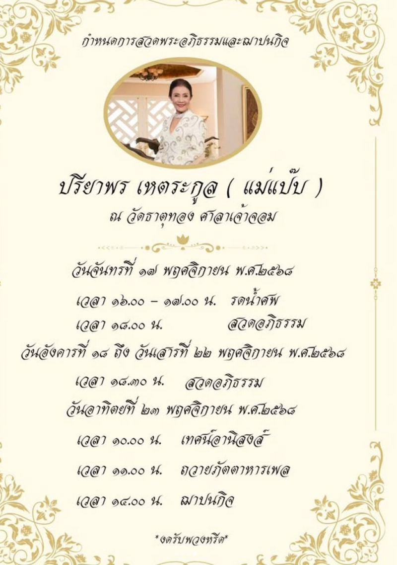 ส่วนพิธีฌาปนกิจจะมีขึ้นในวันอาทิตย์ที่ 23 พ.ย. 68 เวลา 18.00 น.