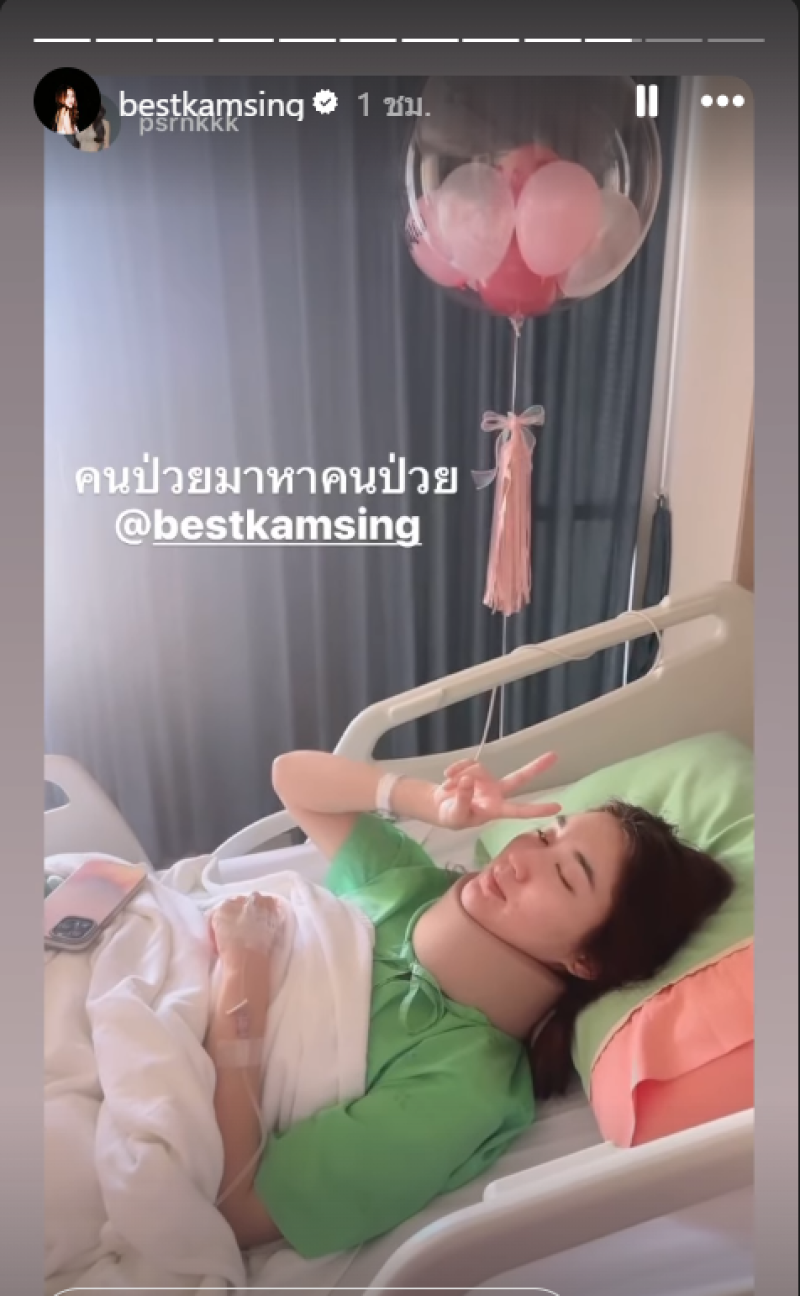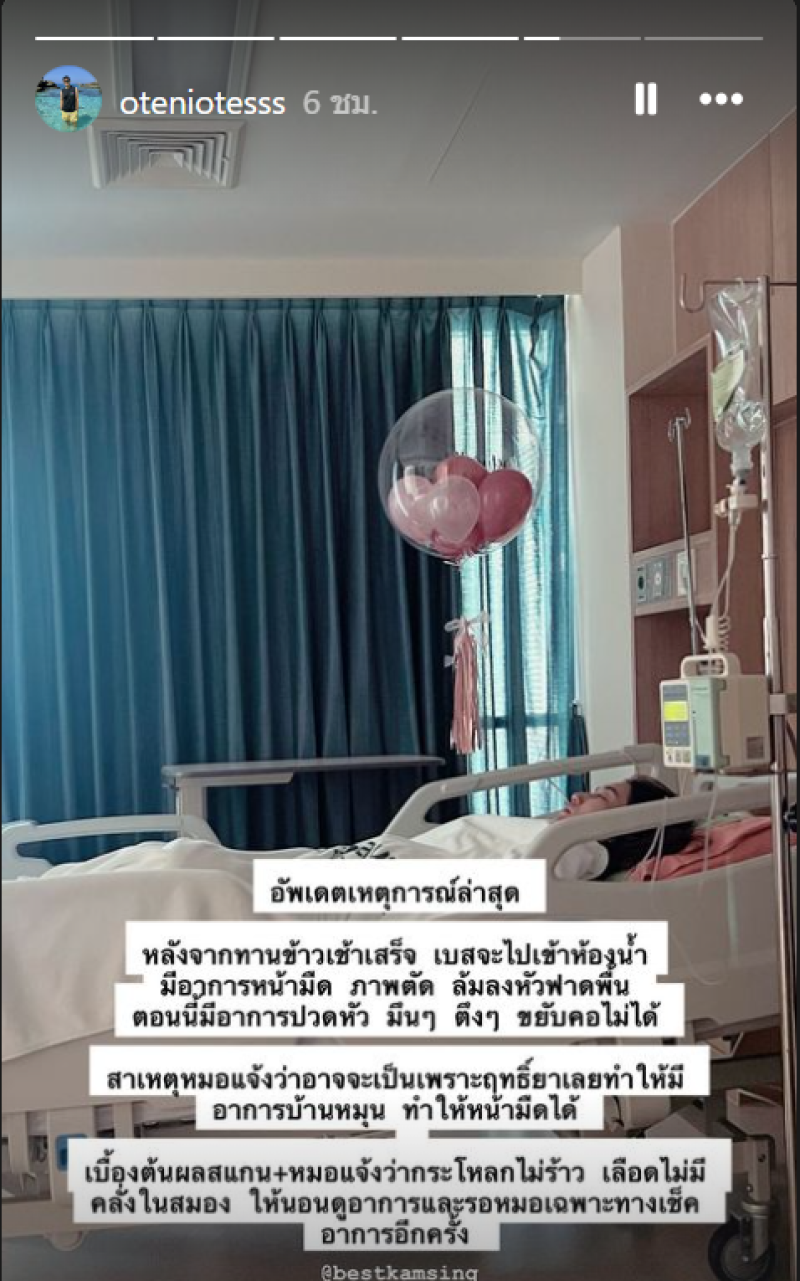 ล่าสุด อินสตราแกรม @oteniotesss แจ้งข่าวด่วนเกี่ยวกับสาวเบสท์ โดยได้โพสต์ผ่านสตอรี่ว่า อัพเดตเหตุการณ์ล่าสุด หลังจากทานข้าวเช้าเสร็จ เบสจะไปเข้าห้องน้ำ มีอาการหน้ามืด ภาพตัด ล้มลงหัวฟาดพื้น ตอนนี้มีอาการปวดหัว มึนๆ ตึงๆ ขยับคอไม่ได้ สาเหตุหมอแจ้งว่าอาจจะเป็นเพราะฤทธิ์ยาเลยทำให้มีอาการบ้านหมุน ทำให้หน้ามืดได้ เบื้องต้นผลสแกน+หมอแจ้งว่ากระโหลกไม่ร้าว เลือดไม่มีคลั่งในสมอง ให้นอนดูอาการและรอหมอเฉพาะทางเช็คอาการอีกครั้ง