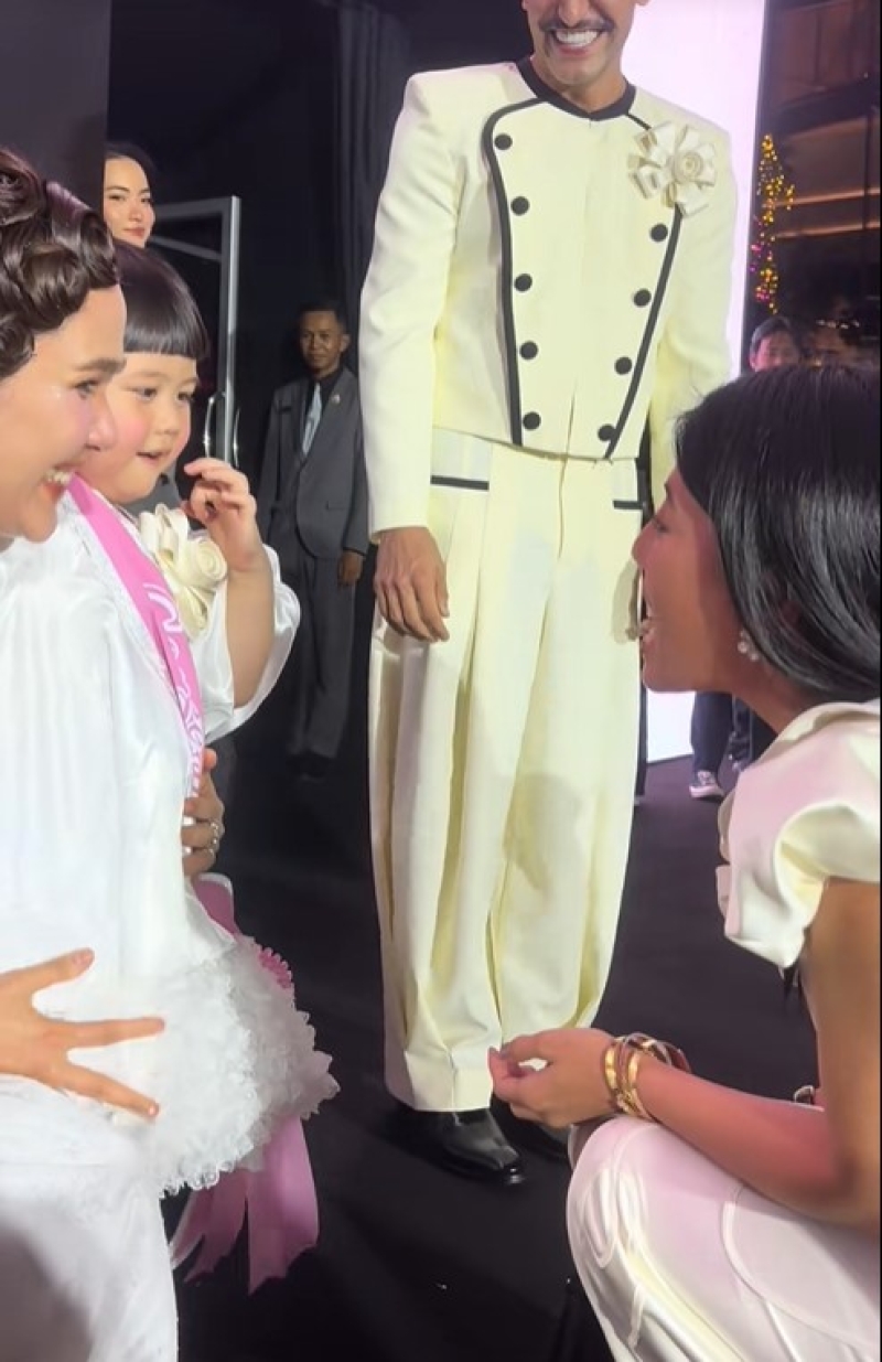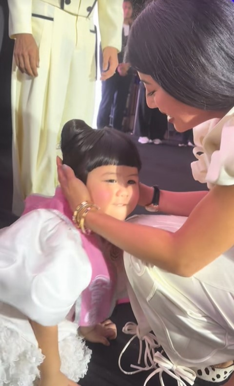 โดย เจ้าฟ้าหญิงก้มลงพูดคุยกับน้องเกลด้วยน้ำเสียงอ่อนโยนสุดละมุน พร้อมชมว่า น้องเกลน่ารักจังเลยลูก แต่งตัวอะไรน่ารักจัง อันนี้ใครแต่งแก้มให้หนูคะ คุณแม่รึเปล่า?