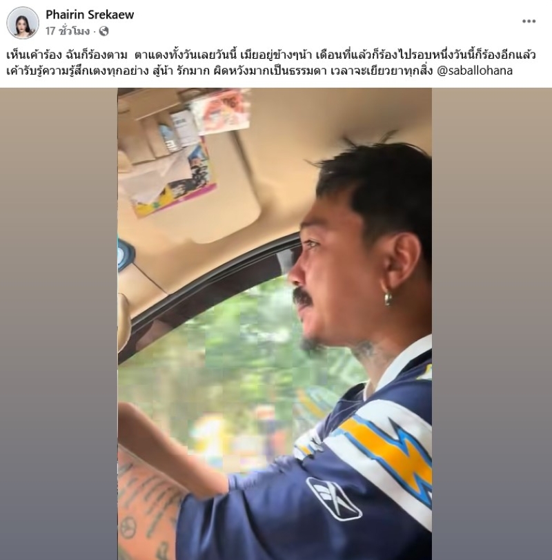 และได้โพสต์สตอรี่เพิ่มว่า 3/10/68 นี่เป็นครั้งแรกที่อยู่กันมา9ปี แล้วฉันเห็นสามีมากอดฉันร้องไห้ แล้วก็นั้งร้องอยู่แบบนี้พักใหญ่ มันอัดอันอยู่ในใจ เพราะความรัก ความไว้ใจได้พังลง สับสน ผิดหวังและเสียใจ ต่อจากนี้ไม่อนุญาติให้ใครมาทำร้ายความรู้สึกสามีของฉันใครทำผัวกูร้องไห้อีก เจอกูค่ะ