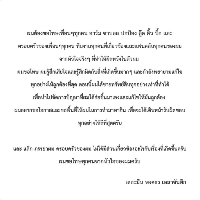 ตอนนี้ผมได้ขายทรัพย์สินทุกอย่างเท่าที่ทำได้ เพื่อนำไปจัดการปัญหาที่ผมได้ก่อขึ้นมาเองและแก้ไขให้มันถูกต้อง ผมอยากขอโอกาสและขอพื้นที่ให้ผมในการทำมาหากิน เพื่อจะได้เดินหน้ารับผิดชอบทุกอย่างให้ดีที่สุดครับ และแต๊ก ภรรยาผม ครอบครัวของผมไม่ได้มีส่วนเกี่ยวข้องอะไรกับเรื่องที่เกิดขึ้นนี้ครับ ผมขอโทษทุกคนจากหัวใจของผมครับ