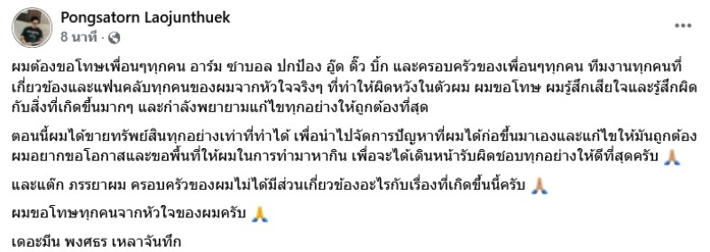 ตอนนี้ผมได้ขายทรัพย์สินทุกอย่างเท่าที่ทำได้ เพื่อนำไปจัดการปัญหาที่ผมได้ก่อขึ้นมาเองและแก้ไขให้มันถูกต้อง ผมอยากขอโอกาสและขอพื้นที่ให้ผมในการทำมาหากิน เพื่อจะได้เดินหน้ารับผิดชอบทุกอย่างให้ดีที่สุดครับ และแต๊ก ภรรยาผม ครอบครัวของผมไม่ได้มีส่วนเกี่ยวข้องอะไรกับเรื่องที่เกิดขึ้นนี้ครับ ผมขอโทษทุกคนจากหัวใจของผมครับ