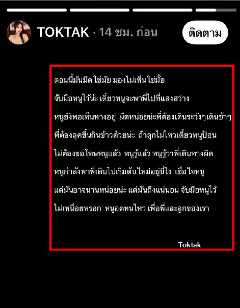 โดยทางภรรยา ของ เดอะมีน เองก็ออกมาเคลื่อนไหวผ่านทางสตอรี่ไอจีว่า ตอนนี้มันมืด ใช่มัย มองไม่เห็นใช่มั้ย จับมือหนูไว้น่ะ เดี๋ยวหนูจะพาพี่ไปที่แสงสว่าง หนูยังพอเห็นทางอยู่ มืดหน่อยน่ะพี่ต้องเดินระวังๆเดินช้าๆ พี่ต้องลุกขึ้นกินข้าวด้วยน่ะ ถ้าลุกไม่ไหวเดี๋ยวหนูป้อน ไม่ต้องขอโทษหนูแล้ว หนูรู้แล้ว หนูรู้ว่าพี่เดินทางผิด หนูกําลังพาพี่เดินไปเริ่มต้นใหม่อยู่นี่ไง เชื่อใจหนู แต่มันอาจนานหน่อยน่ะ แต่มันถึงแน่นอน จับมือหนูไว้ ไม่เหนื่อยหรอก หนูอดทนไหว เพื่อพี่และลูกของเรา Toktak