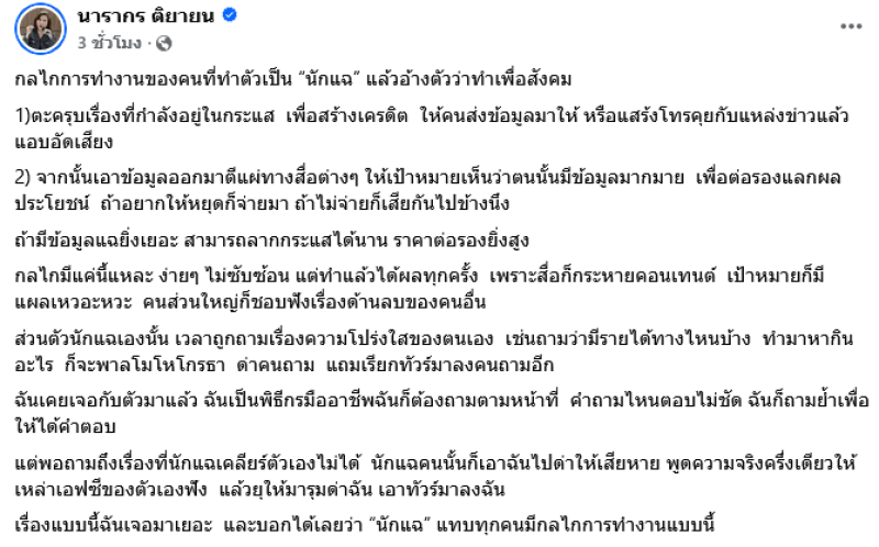 ทำเอาโซเชียลต่างเข้ามาคอมเมนต์กันไม่น้อยเมื่อทางด้านผู้ประกาศข่าว ต๊ะ นารากร ติยายน ได้ออกมาโพสต์ข้อความกลไกการทำงานของคนที่ทำตัวเป็น นักแฉ แล้วอ้างตัวว่าทำเพื่อสังคม โดยระบุว่า 1)ตะครุบเรื่องที่กำลังอยู่ในกระแส เพื่อสร้างเครดิต ให้คนส่งข้อมูลมาให้ หรือแสร้งโทรคุยกับแหล่งข่าวแล้วแอบอัดเสียง
