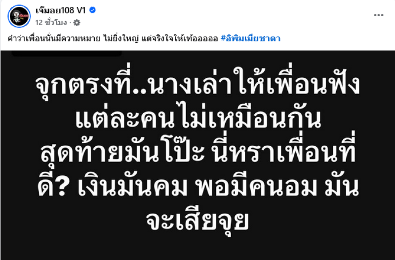 จุกตรงที่ นางเล่าให้เพื่อนฟังแต่ละคนไม่เหมือนกันสุดท้ายมันโป๊ะ นี่หราเพื่อนที่ดี เงินมันคม พอมีคนอม มันจะเสียจุย ท่ามกลางชาวเน็ตต่างเข้ามาคอมเมนต์กันอย่างมาก