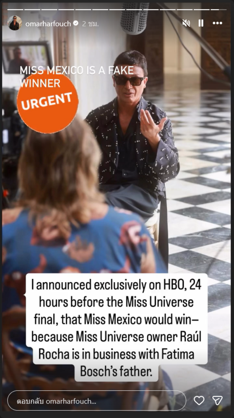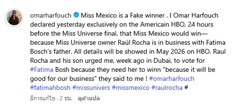 ก่อนรอบไฟนอลมิสยูนิเวิร์ส 24 ชั่วโมงว่า มิสเม็กซิโกจะชนะเพราะเจ้าของมิสยูนิเวิร์ส Raúl Rocha มีธุรกิจร่วมกับพ่อของ Fatima Bosch รายละเอียดทั้งหมดจะถูกเปิดเผยในเดือนพฤษภาคม 2026 ทาง HBO Raul Rocha