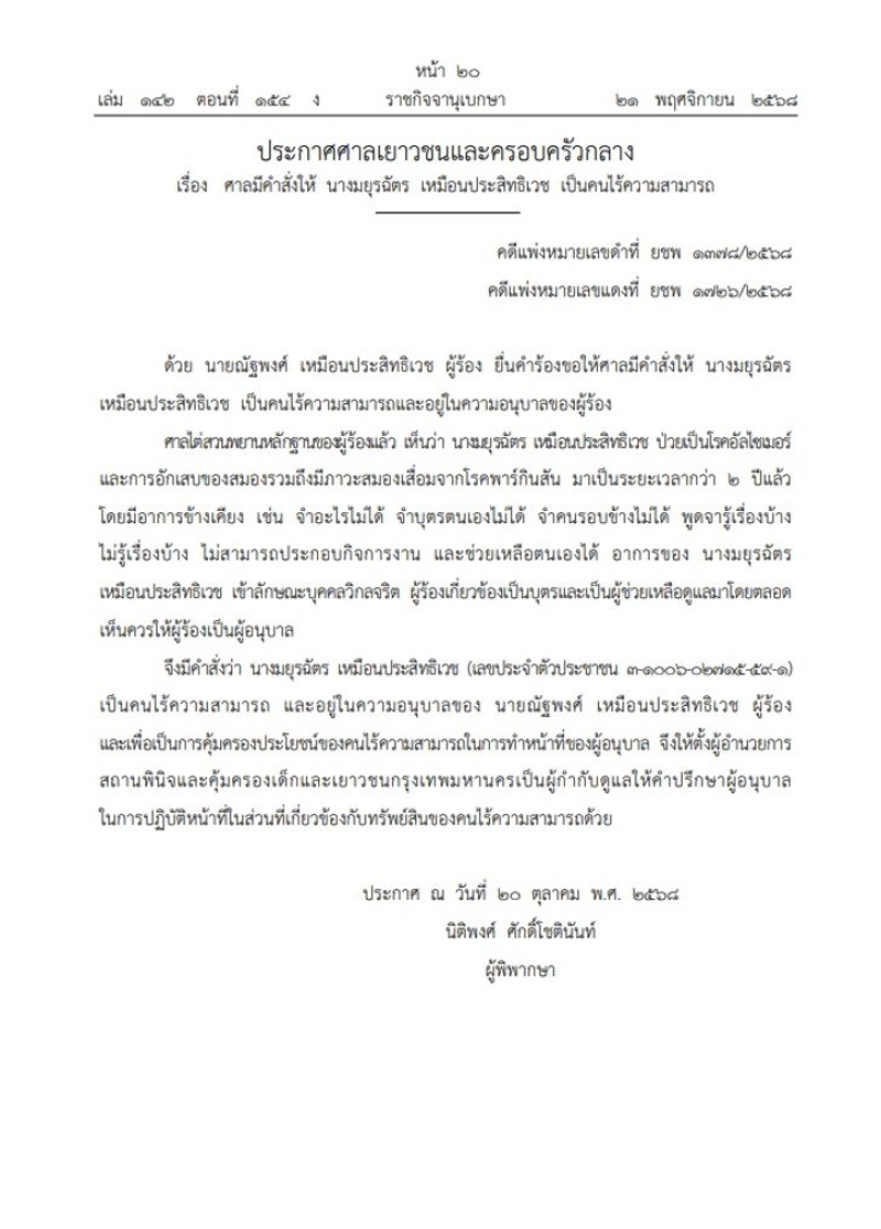 เมื่อวันที่ 21 พฤศจิกายน เว็บไซ์ราชกิจจานุเบกษา ประกาศศาลเยาวชนและครอบครัวกลางเรื่อง ศาลมีคำสั่งให้ นางมยุรฉัตร เหมือนประสิทธิเวช เป็นคนไร้ความสามามารถ ด้วย นายณัฐพงศ์ เหมือนประสิทธิเวช ผู้ร้อง ยื่นคำร้องขอให้ศาลมีคำสั่งให้ นางมยุรฉัตร เหมือนประสิทธิเวช เป็นคนไร้ความสามารถและอยู่ในความอนุบาลของผู้ร้อง