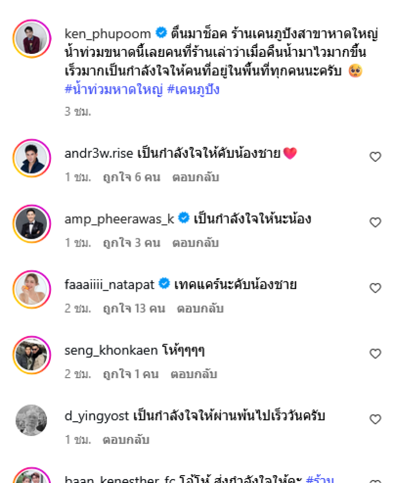 ล่าสุดน้ำท่วมหาดใหญ่ จ.สงขลา โดยทางด้านพระเอกหนุ่ม เคน ภูภูมิ ก็ได้รับผลกระทบด้วย โดยเจ้าตัวได้ออกมาโพสต์ภาพร้านเคนภูปังสาขาหาดใหญ่ถูกน้ำท่วม พร้อมเขียนแปคชั่นระบุว่า