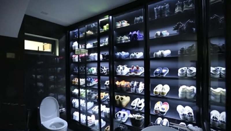 แม้แต่ในห้องน้ำยังมีความพิเศษ ด้วยการจัดโชว์ชั้นวางรองเท้าของเวย์ ที่เรียกว่าเป็นคอลเลกชันแฟชั่นสตรีทแวร์เต็มสไตล์ สะท้อนความเป็นตัวตน และรสนิยมของคุณพ่อสุดเท่ได้อย่างชัดเจน
