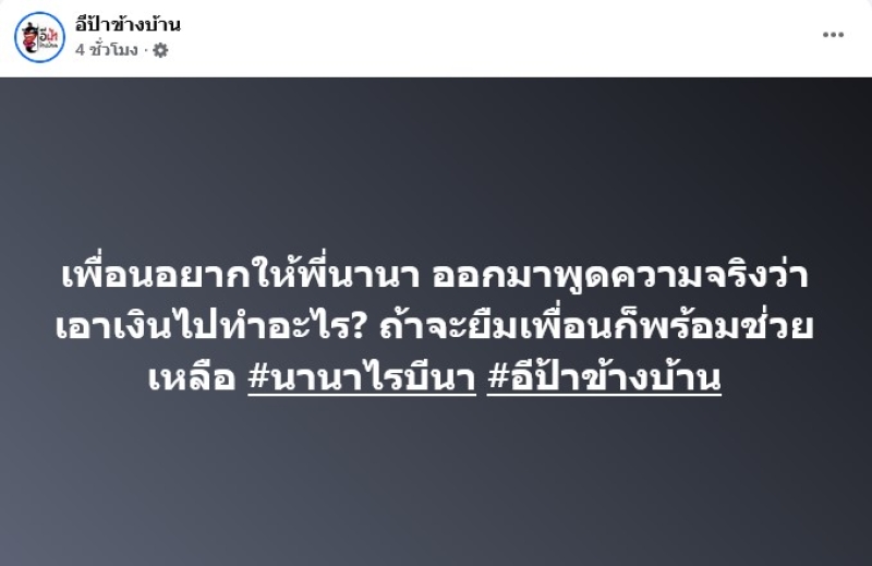 ล่าสุด เพจดัง อย่าง อีป้าข้างบ้าน ได้ออกมาโพสต์ว่า เพื่อนอยากให้พี่นานา ออกมาพูดความจริงว่าเอาเงินไปทำอะไร? ถ้าจะยืมเพื่อนก็พร้อมช่วยเหลือ #นานาไรบีนา #อีป้าข้างบ้าน