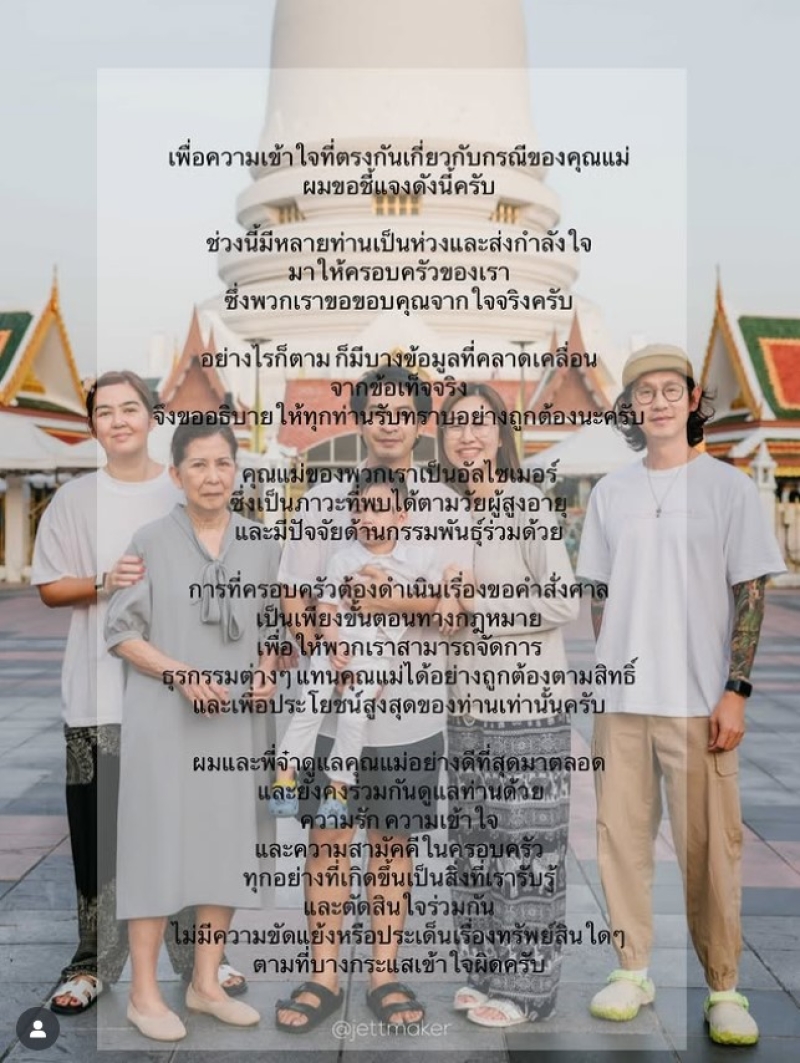 ผมและพี่จ๋าดูแลคุณแม่อย่างดีที่สุดมาตลอด และยังคงร่วมกันดูแลท่านด้วยความรัก ความเข้าใจ และความสามัคคีในครอบครัว ทุกอย่างที่เกิดขึ้นเป็นสิ่งที่เรารับรู้และตัดสินใจร่วมกัน ไม่มีความขัดแย้งหรือประเด็นเรื่องทรัพย์สินใดๆ ตามที่บางกระแสเข้าใจผิดครับ