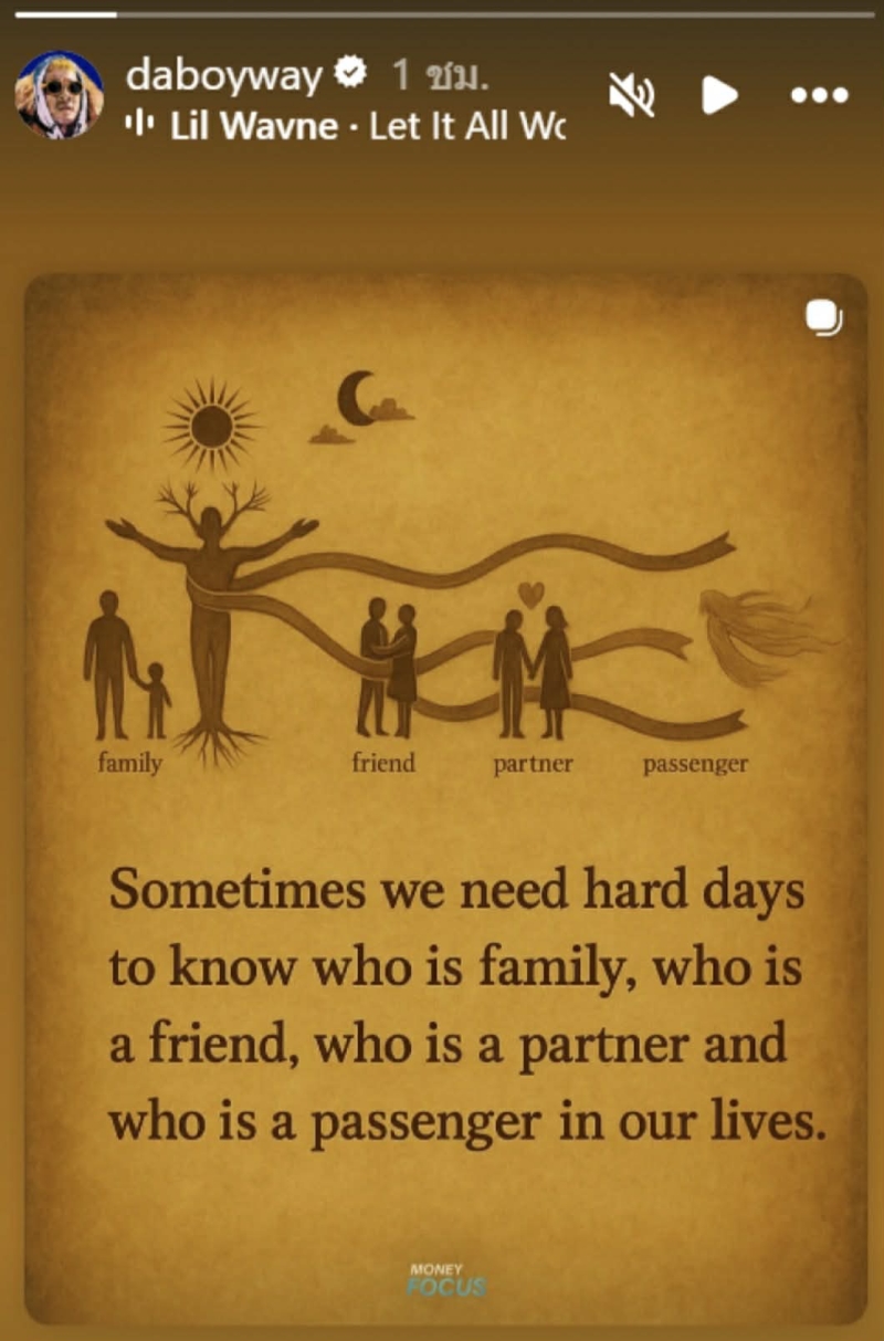 ล่าสุด ความเคลื่อนไหวของ เวย์ ไทเทเนียม สามีของนานา กลายเป็นประเด็นที่แฟนๆ ให้ความสนใจเช่นกัน เมื่อ เขา โพสต์สตอรี่ข้อความภาษาอังกฤษที่เต็มไปด้วยนัยยะลึก