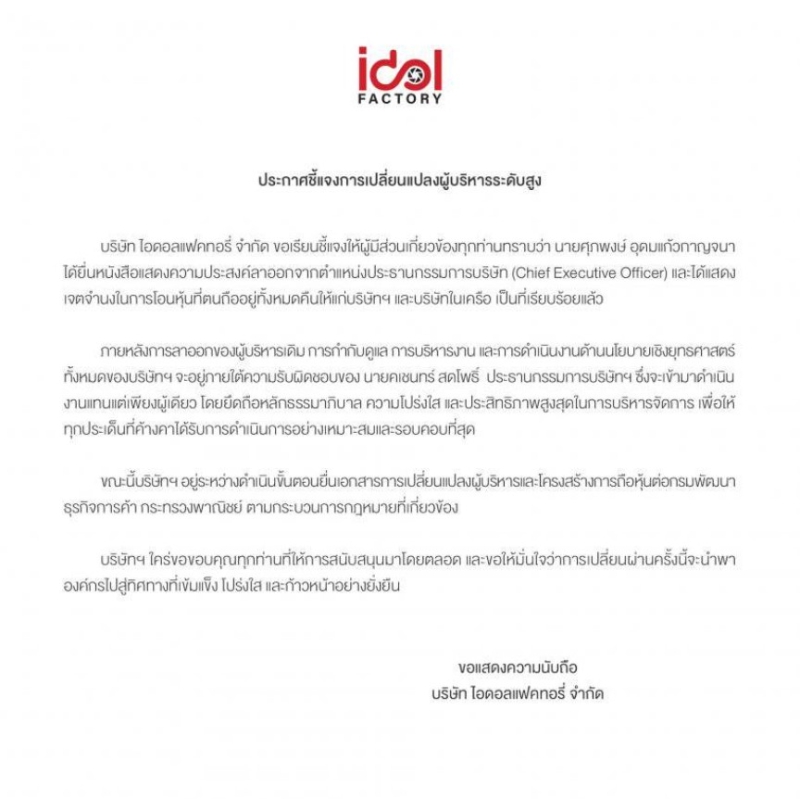 จากกรณีที่ก่อนหน้านั้น ได้มีข่าว ทำเอาแฟนๆตกใจหนักมาก เมื่อ บริษัท ไอดอลแฟคทอรี่ จำกัด ประกาศ แจ้งการเปลี่ยนมือบริหารค่าย ดาราหนุ่ม อย่าง เซ้นต์ ศุภพงษ์ ได้ลาออกจากตำแหน่งประธานกรรมการบริษัทนั้นเอง