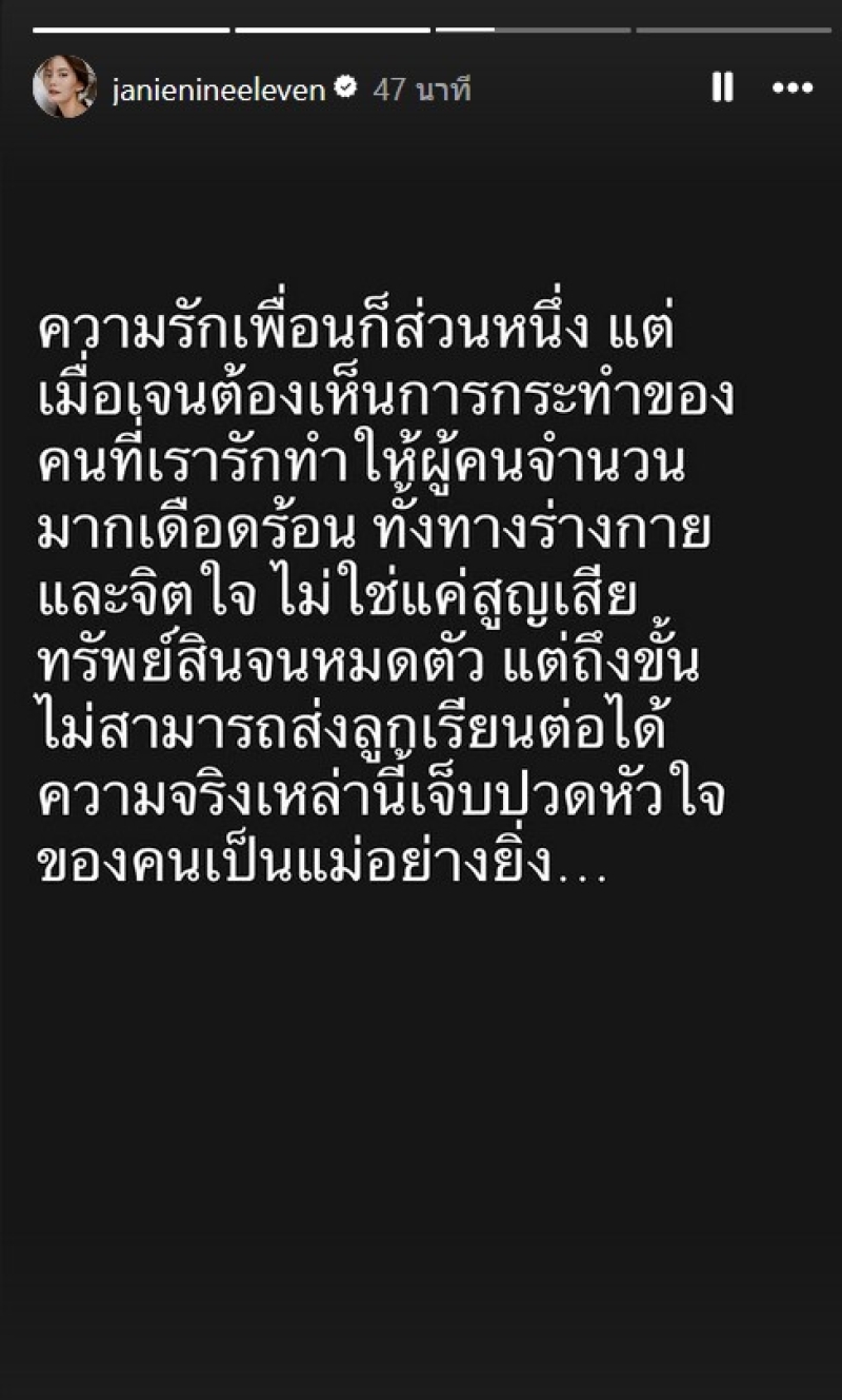 ล่าสุด เจ้าตัวออกมาโพสต์อีกครั้ง โดยได้เผยว่า ความรักเพื่อนก็ส่วนหนึ่ง แต่ เมื่อเจนต้องเห็นการกระทําของ คนที่เรารักทําให้ผู้คนจํานวน มากเดือดร้อน ทั้งทางร่างกาย และจิตใจ ไม่ใช่แค่สูญเสีย ทรัพย์สินจนหมดตัว แต่ถึงขั้น ไม่สามารถส่งลูกูเรียนต่อได้ ความจริงเหล่านีเจ็บปวดหัวใจ ของคนเป็นแม่อย่างยิ่ง...