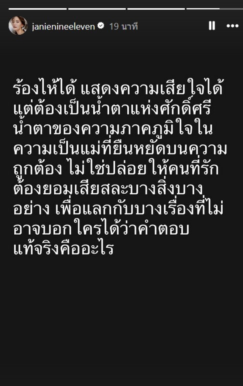 และอีกโพสต์คือ ร้องไห้ได้ แสดงความเสียใจได้ แต่ต้องเป็นนํ้าตาแห่งศักดิ์ศรี น้ําตาของความภาคภูมิใจใน ความเป็นแม่ที่ยืนหยัดบนความ ถูกต้อง ไม่ใช่ปล่อยให้คนที่รัก ต้องยอมเสียสละบางสิ่งบาง อย่าง เพื่อแลกกับบางเรื่องที่ไม่ อาจบอกใครได้ว่าคําตอบ แท้จริงคืออะไร