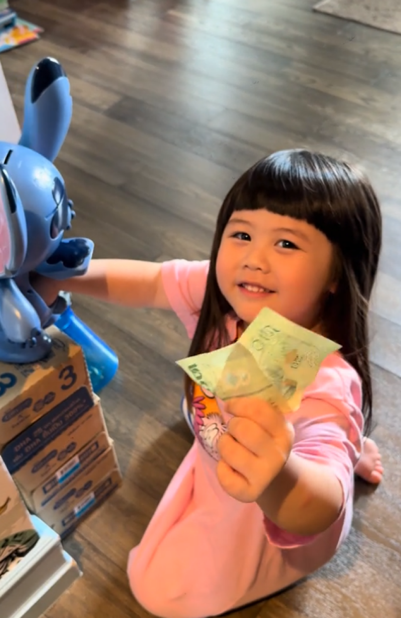 ล่าสุดก็มีคลิปน่ารักๆ ขณะ น้องเกล พา มอส เพื่อนสนิทต่างวัยที่มาเล่นด้วยกันที่บ้าน ไป แคะกระปุกออมสินของเจ้าตัว เพื่อจะให้ยืมเงินไปซื้อกางเกงตัวใหม่ ซึ่งพอเปิดกระปุกออกมาเท่านั้น มอสถึงกับช็อก พร้อมอุทานว่า ห้ะ ทำงานมาทั้งชีวิต มีแค่นี้เหรอ