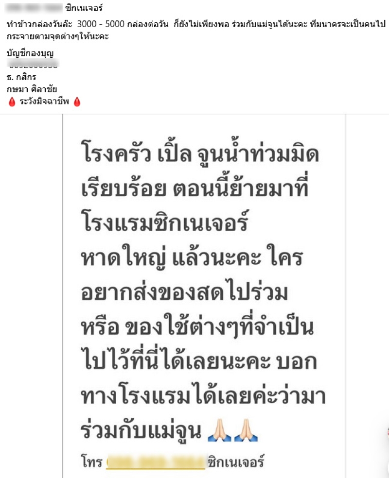 โรงครัวเปิ้ล จูนน้ำท่วมมิด เรียบร้อย ตอนนี้ย้ายมาที่โรงแรมซิกเนเจอร์ หาดใหญ่แล้วนะคะ ใครอยากส่งของสดไปร่วมหรือของใช้ต่างๆ ที่จําเป็นไปไว้ที่นี่ได้เลยนะคะ บอกทางโรงแรมได้เลยค่ะว่ามาร่วมกับแม่จูน และ ทำข้าวกล่องวันละ 3000 - 5000 กล่องต่อวันก็ยังไม่เพียงพอ ร่วมกับแม่จูนได้นะคะ ทีมนาครจะเป็นคนไปกระจายตามจุดต่างๆให้นะคะ