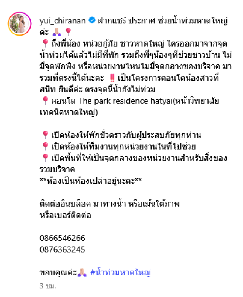 จากเหตุการณ์น้ำท่วมหาดใหญ่ จังหวัดสงขลา ล่าสุดนางเอกสาวคุณแม่ลูกหนึ่ง ยุ้ย จีรนันท์ ได้ประกาศถึงผู้ประสบภัยหากไม่มีจุดพักพิง ยินดีให้มาพักที่คอนโดน้องคนสนิทได้ รวมถึงเจ้าหน้าที่กู้ภัยทุกหน่วย หรือสามารถเป็นพื้นที่ลงของบริจาคได้เช่นกัน