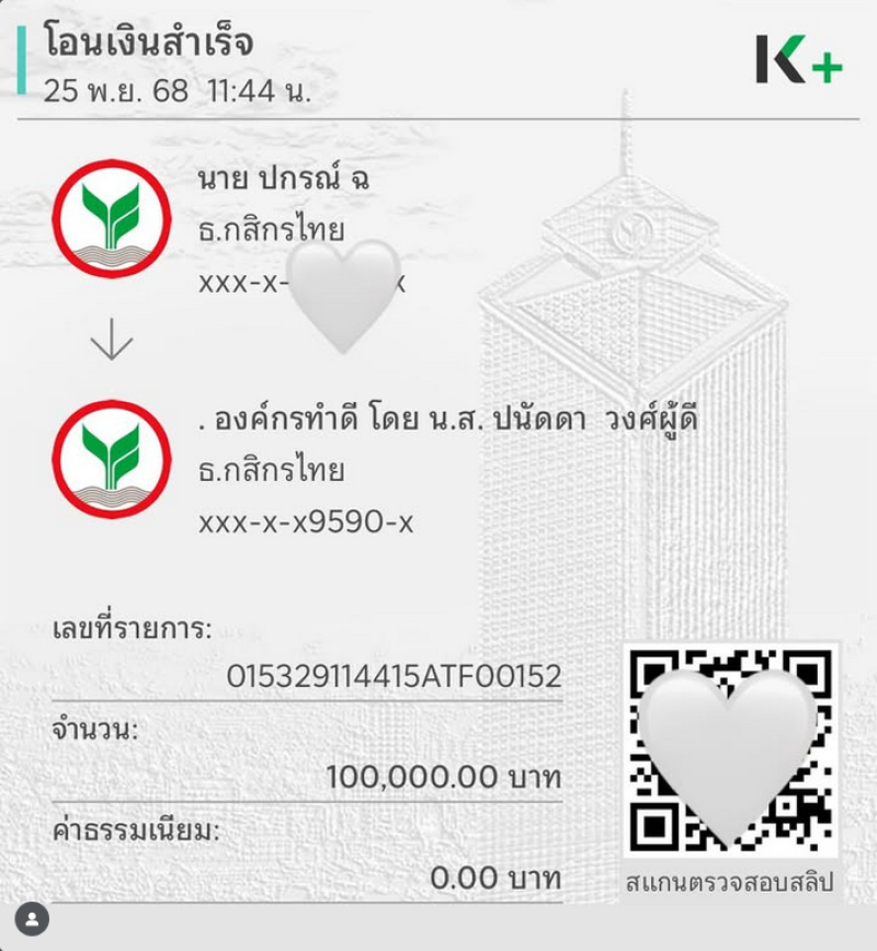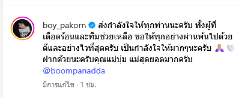 ล่าสุดพระเอกหนุ่ม บอย ปกรณ์ ได้ร่วมบริจาคเงินให้องค์กรทำดี 1 แสนบาท เพื่อช่วยเหลือผู้ประสบภัยน้ำท่วม ระบุว่า ส่งกำลังใจให้ทุกท่านนะครับ ทั้งผู้ที่เดือดร้อนและทีมช่วยเหลือ ขอให้ทุกอย่างผ่านพ้นไปด้วยดีและอย่างไวที่สุดครับ เป็นกำลังใจให้มากๆ นะครับ ฝากด้วยนะครับคุณแม่บุ๋ม แม่สุดยอดมากครับ