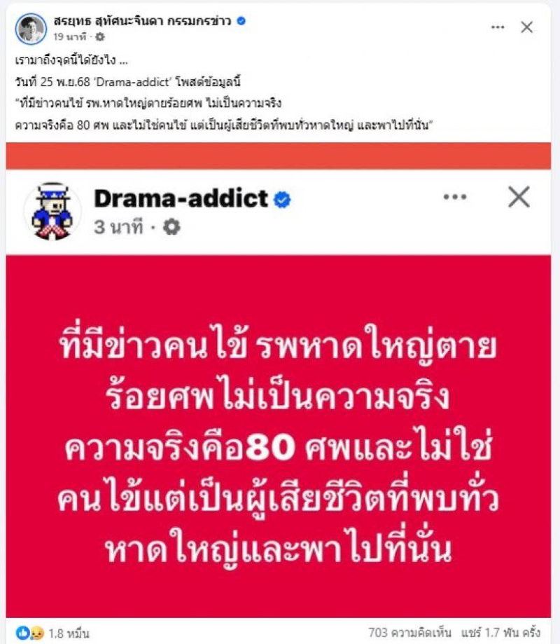 ล่าสุดทางด้านผู้ประกาศข่าว สรยุทธ สุทัศนะจินดา ได้แชร์โพสต์จากเพจดัง Drama-addict พร้อมแคปชั่นที่อ่านแล้วจุกอกว่า เรามาถึงจุดนี้ได้ยังไง ก่อนหน้านี้มีข่าวลือว่อนเน็ตว่า รพ.หาดใหญ่ มีคนไข้เสียชีวิตรวดเดียว 100 ศพ โดย สรยุทธ แจงว่า รพ.หาดใหญ่ตายร้อยศพ ไม่เป็นจริง ความจริงคือ 80 ศพ และไม่ใช่คนไข้