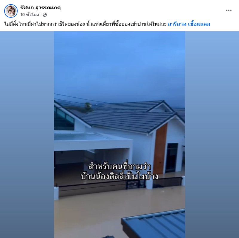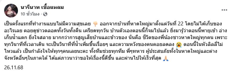 โดย ลิลลี่ ได้ออกมาโพสต์ข้อความระบุว่า เป็นครั้งแรกที่ทำงานแบบไม่มีความสุขเลย ออกจากบ้านที่หาดใหญ่มาตั้งแต่วันที่ 22 โดยไม่ได้เก็บของอะไรเลย คอยดูข่าวตลอดทั้งวันทั้งคืน เครียดทุกวัน บ้านตัวเองตอนนี้ก็จมไปแล้ว ยิ่งมารู้ว่าตอนนี้พายุเข้า อ่างเก็บน้ำแตก ยิ่งใจสลาย