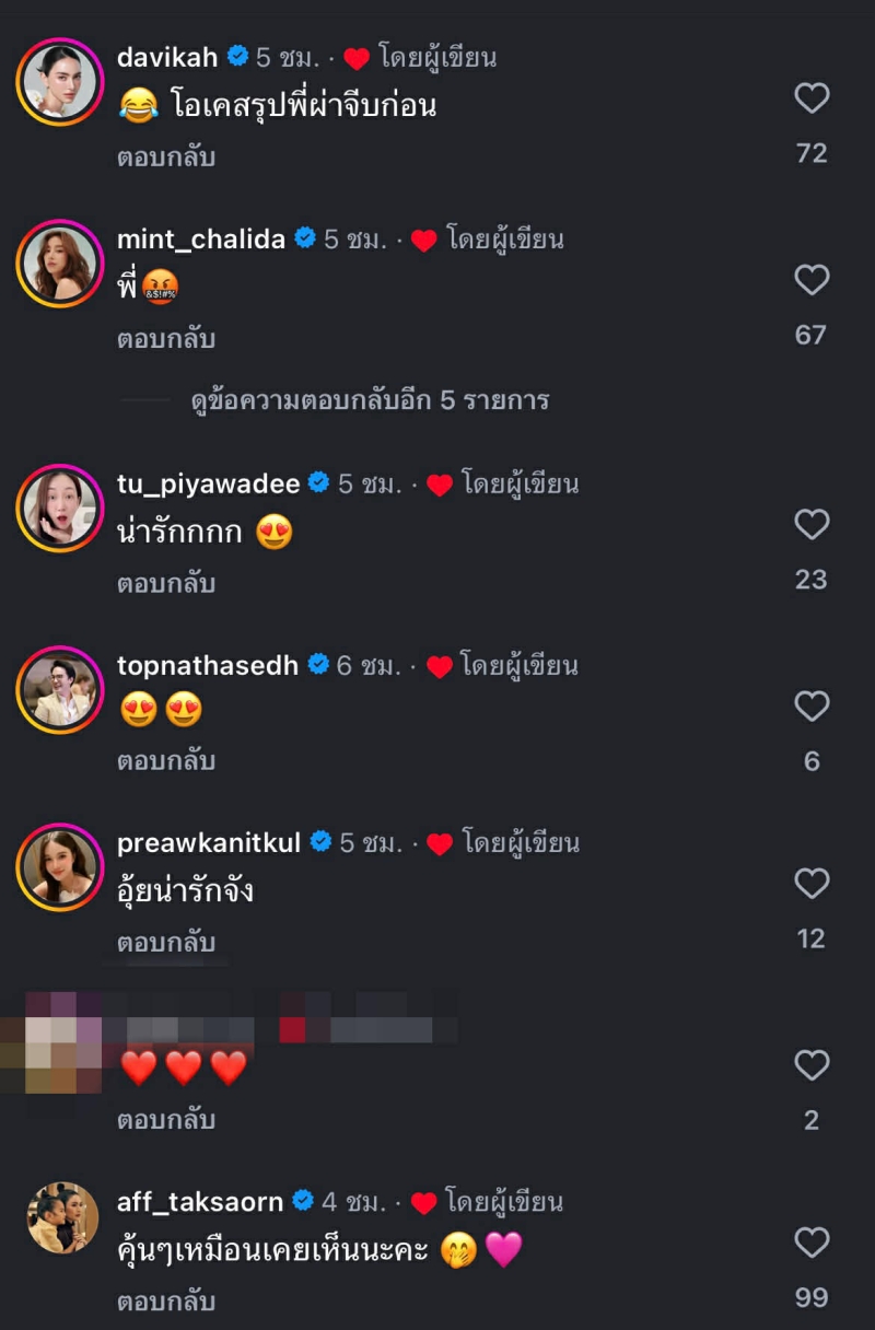 ขณะเดียวกัน เพื่อนสนิทอย่าง แอฟ ทักษอร ก็เข้ามาร่วมแซวด้วยข้อความว่า เหมือนเคยเห็นฉากนี้นะคะ ส่วน ใหม่ ดาวิกา ก็ไม่พลาดทิ้งคอมเมนต์สรุปสั้นๆ แต่โดนใจว่า ชัดเจนแล้วค่ะ พี่ผา เริ่มก่อน เติมความสนุกให้โพสต์นี้กลายเป็นอีกหนึ่งโมเมนต์หวานปนฮาของคู่รักสุดน่ารักคู่นี้