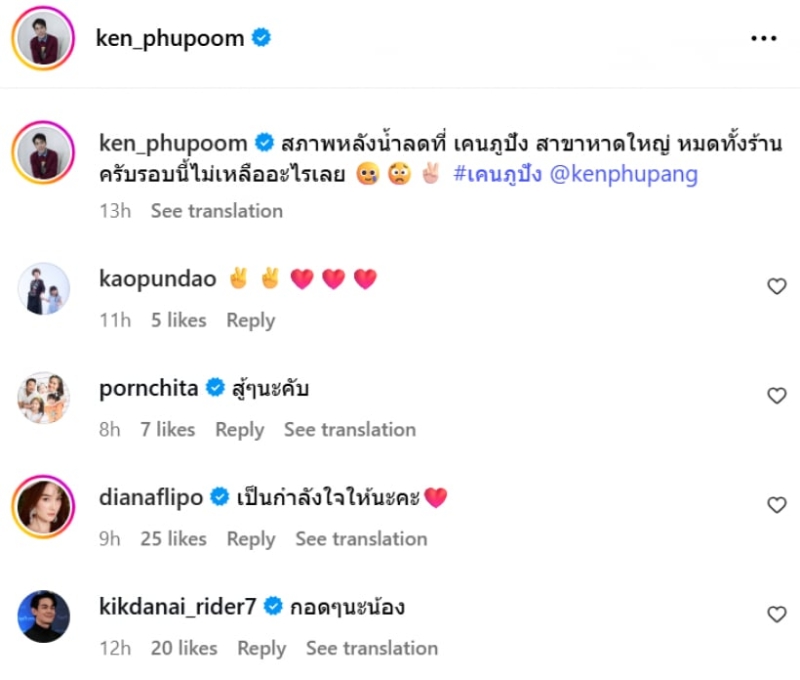 หลังโพสต์เผยแพร่ออกไป เพื่อนดาราหลายคนต่างเข้ามาให้กำลังใจ เคน ภูภูมิ อย่างอบอุ่น