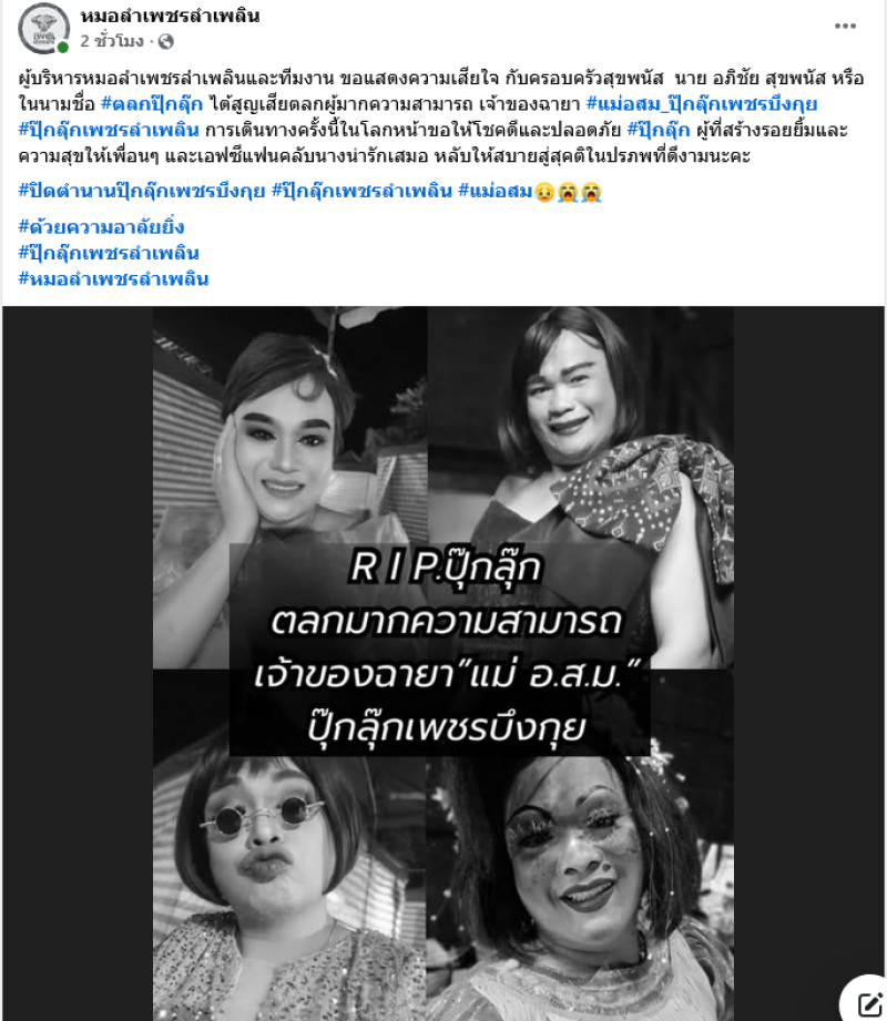 ล่าสุดทางด้านเพจหมอลำเพชรลำเพลิน ได้ออกมาโพสต์แจ้งข่าวเศร้าของแฟนๆเเละชาวคณะระบุว่า ผู้บริหารหมอลำเพชรลำเพลินและทีมงาน ขอแสดงความเสียใจ กับครอบครัวสุขพนัส นาย อภิชัย สุขพนัส หรือในนามชื่อ #ตลกปุ๊กลุ๊ก