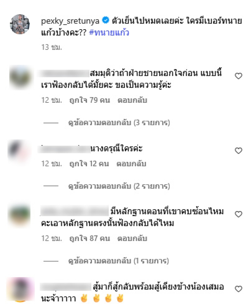 ตัวเย็นไปหมดเลยค่ะ ใครมีเบอร์ทนายแก้วบ้างคะ? #ทนายแก้ว โดยมีแฟนๆต่างเข้ามาคอมเมนต์แนะนำ อาทิ สมมุติว่าถ้าฝ่ายชายนอกใจก่อน แบบนี้เราฟ้องกลับได้มั้ยคะ ขอเป็นความรู้ค่ะ,มีหลักฐานตอนที่เขาคบซ้อนไหมคะเอาหลักฐานตรงนั้นฟ้องกลับได้ไหม,อห เป็นกำลังใจให้นะคะ