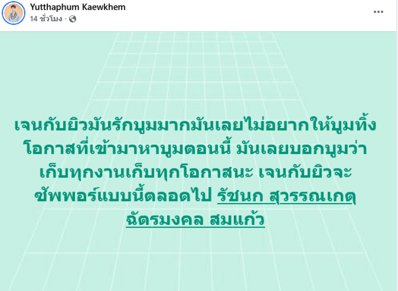 ล่าสุด บูม ได้ออกมาโพสต์อธิบายรัวๆว่า บูมกับเจนไม่ได้ทะเลาะกันตีกันแต่เจนเป็นคนบอกบูมเองว่ามึงถ้ามีโอกาสเข้ามามึงไปเลยนะอย่าทิ้งโอกาสที่เข้ามา เพื่อนเข้าใจบูมมากๆและสนับสนุนบูมทุกทาง เพราะเจนมันก็อยากให้บูมงานเยอะๆเพื่อจะดูแลครอบครัวและเลี้ยงลูกน้องได้
