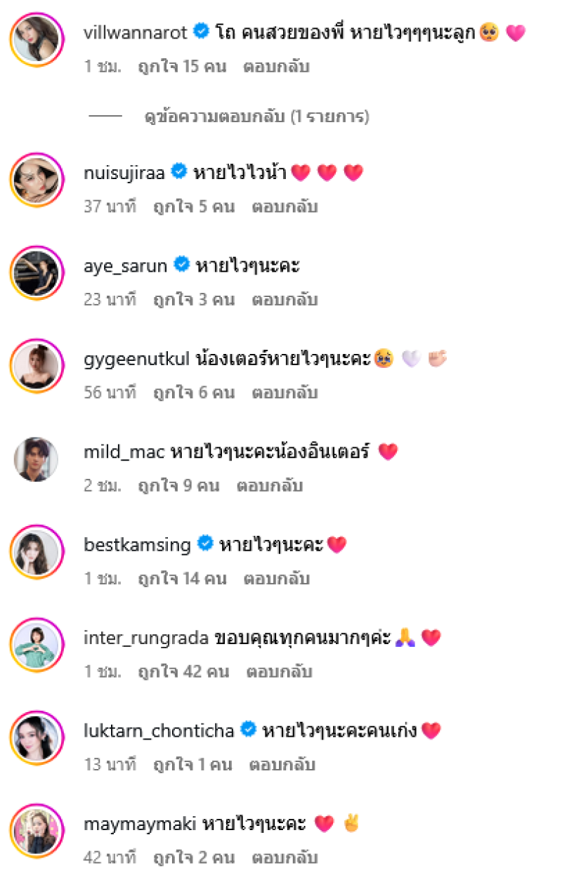 และขอบคุณครูจ๋าครูฝ้ายที่อุ้มมาส่งขึ้นรถ ตอนนี้รอผ่าตัด ดามเหล็ก ขอบคุณทุกคนที่เป็นห่วง ส่งกำลังใจมาให้น้องอินเตอร์นะคะ ท่ามกลางพี่ๆในวงการต่างเข้ามาคอมเมนต์ส่งกำลังใจกันอย่างมาก
