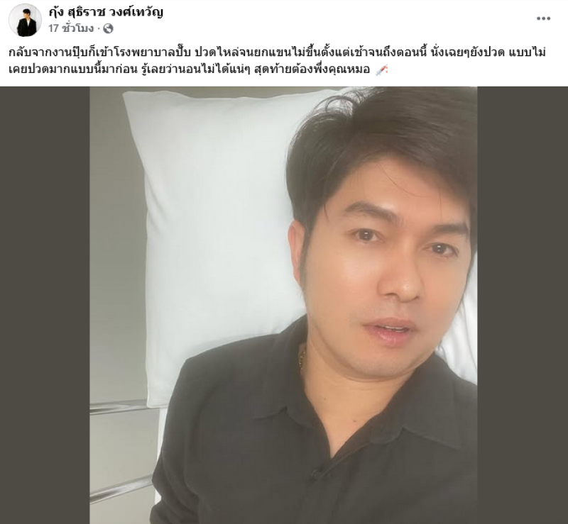 ทำเอาแฟนๆต่างเป็นห่วงและส่งกำลังใจกันอย่างมากเมื่อนักร้องลูกทุ่ง กุ้ง สุธิราช วงศ์เทวัญ ได้ออกมาโพสต์ภาพพร้อมข้อความว่า กลับจากงานปุ๊บก็เข้าโรงพยาบาลปั๊บ ปวดไหล่จนยกแขนไม่ขึ้นตั้งแต่เช้าจนถึงตอนนี้ นั่งเฉยๆยังปวด แบบไม่เคยปวดมากแบบนี้มาก่อน รู้เลยว่านอนไม่ได้แน่ๆ สุดท้ายต้องพึ่งคุณหมอ