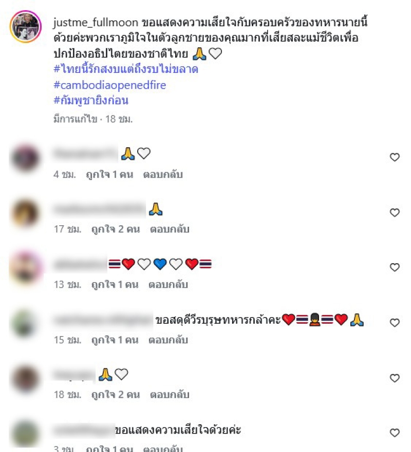 ล่าสุด นักแสดงรุ่นใหญ่ อย่าง ตุ๊ก เดือนเต็ม ได้ออกมาโพสต์ข้อความผ่านอินสตาแกรมส่วนตัว "@justme_fullmoon" ระบุข้อความว่า "จัดการให้มันจบๆ ไปสักทีเถอะ อย่าให้ทหารไทยต้องได้รับการสูญเสียอีกเลย กัมพูชาใช้ปืนใหญ่ และเครื่องยิงลูกระเบิดยิงใส่ฐานอนุพงศ์ ทหารไทยสูญเสีย 2 นาย บาดเจ็บ 8 นาย ไทยตอบโต้ด้วย F-16 เป้าหมายที่ตั้งอาวุธกัมพูชา ที่เป็นอาวุธสนับสนุนระยะไกล และเป็นภัยคุกคาม"