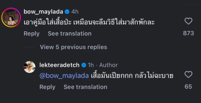 แต่สิ่งที่ถูกพูดถึงหนักมาก คือคอมเมนต์ จากเจ้าของตัวจริง อย่างนางเอกสาวสุดน่ารัก โบว์ เมลดา ที่รีบมาคุมอุณหภูมิความฮอตของแฟนทันที โบว์ได้คอมเมนต์แซวแบบน่ารักๆ แต่ก็ทำเอาคนอ่านแอบสะดุ้งแทนอาเล็กเบาๆ ว่า เอาคู่มือใส่เสื้อป้ะ เหมือนจะลืมวิธีใส่มาสักพักละ ซึ่งงานนี้หนุ่มอาเล็ก ก็ได้เข้ามาแก้ตัวว่า เสื้อมันเปียกกก กลัวไม่ฉะบาย
