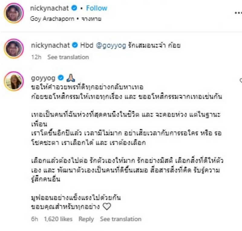 สาวก้อย มาคอมเมนต์บอกว่า "ขอให้คำอวยพรที่ดีทุกอย่างกลับหาเทอ ก้อยขอโหสิกรรมให้เทอทุกเรื่อง และ ขออโหสิกรรมจากเทอเช่นกัน เทอเป็นคนที่ฉันห่วงที่สุดคนนึงในชีวิต และ จะคอยห่วง แต่ในฐานะเพื่อน