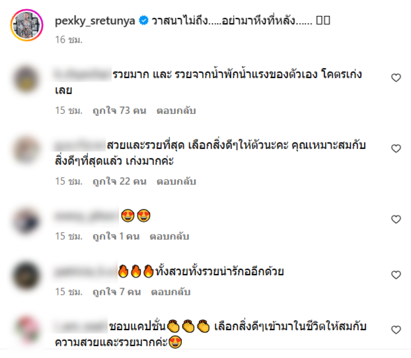 งานนี้ เหล่าแฟนคลับเข้ามาคอมเมนต์กันจำนวนมาก และชมความสวยและรวยของสาวเป็กกี้ด้วย