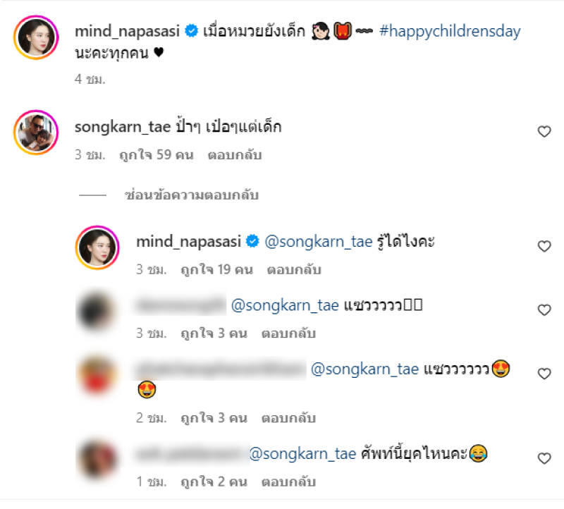 ล่าสุด สาวมายด์ ได้โพสต์รูปในวันเด็ก เพื่อย้อนวัยตัวเองผ่านทางอินสตาแกรม พร้อมระบุข้อความว่า เมื่อหมวยยังเด็ก #happychildrensday นะคะทุกคน แต่หนุ่มสงกรานต์นั้นได้โผล่มาคอมเมนต์ว่า ป้ำๆ เป๋อๆแต่เด็ก และสาวมายด์นั้นจึงตอบกลับว่า รู้ได้ไงคะ บอกเลยว่ามีชาวเน็ตเข้าไปแซวทั้งคู่กันเพียบ รอลุ้นเปิดตัวเลยจ้า