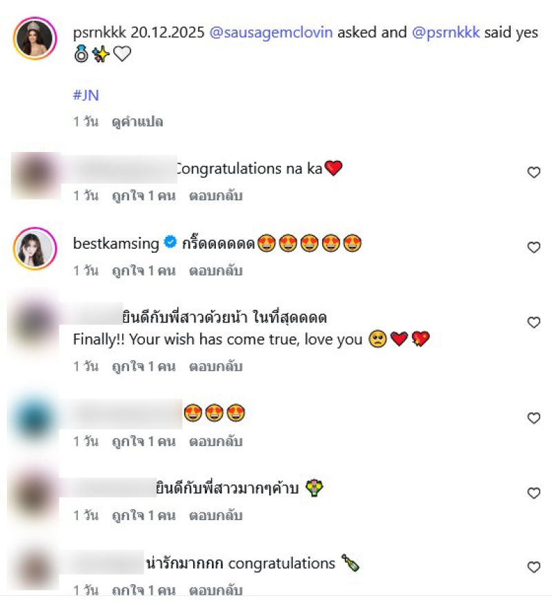 เรียกได้ว่า เป็นนางงามขวัญใจแฟนๆเพียบ สำหรับ นิ้งค์ พรศิริกุล รองอันดับ 1 นางสาวไทย 2567 ที่ล่าสุด ได้เผยข่าวดี ผ่านทางอินสตาแกรมส่วนตัว พร้อมแคปชั่นว่า 20.12.2025 @sausagemclovin asked and @psrnkkk said yes ซึ่งได้ถูกแฟนหนุ่มคุกเข่าขอแต่งงานแล้ว ท่ามกลางบรรยากาศสุดโรแมนติก