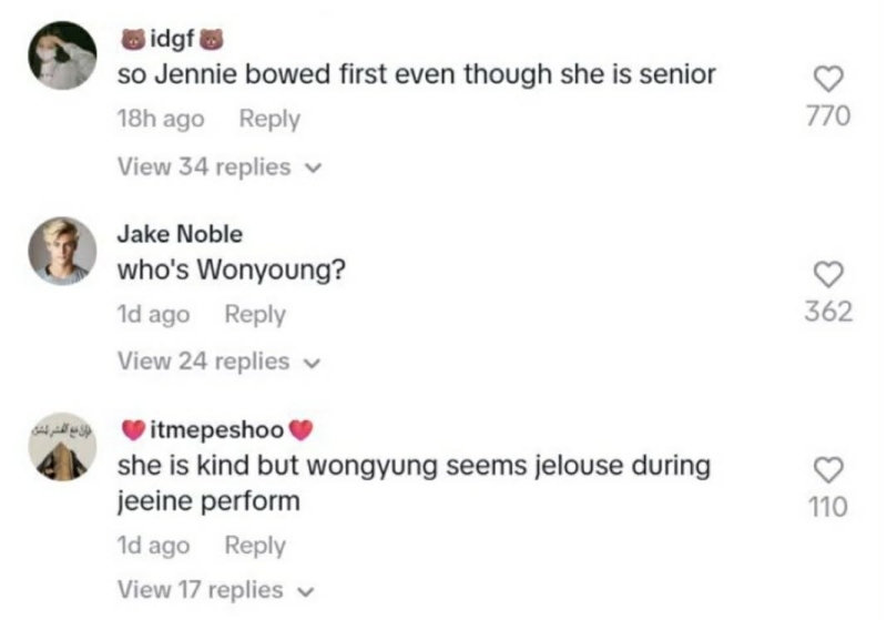 ฝั่งคอมเมนต์บางส่วน วิพากษ์วิจารณ์ วอนยอง อย่างหนัก พร้อมยกภาพลักษณ์ เจนนี่ ขึ้นมาเทียบในฐานะรุ่นพี่ ที่ให้เกียรติผู้อื่น จนประเด็นมารยาทถูกหยิบมาเป็นหัวข้อถกเถียงร้อนแรง
