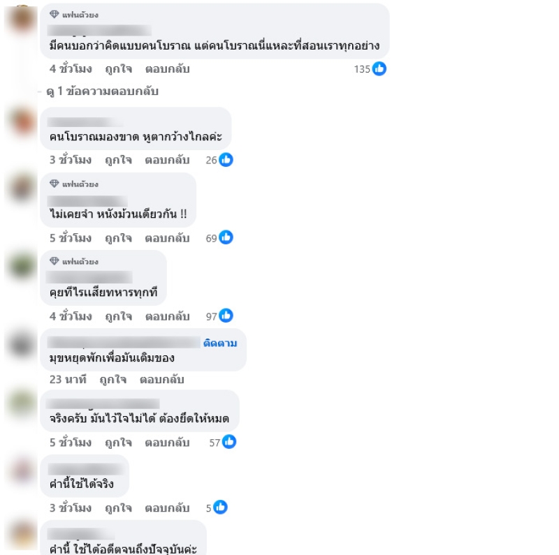 ท่ามกลางชาวเน็ตต่างเข้ามาคอมเมนต์เห็นด้วยกันอย่างมาก อาทิ มีคนบอกว่าคิดแบบคนโบราณ แต่คนโบราณนี่แหละที่สอนเราทุกอย่าง,คนโบราณมองขาด หูตากว้างไกลค่ะ,มุขหยุดพักเพื่อมันเติมของ,จริงครับ มันไว้ใจไม่ได้ ต้องยึดให้หมด