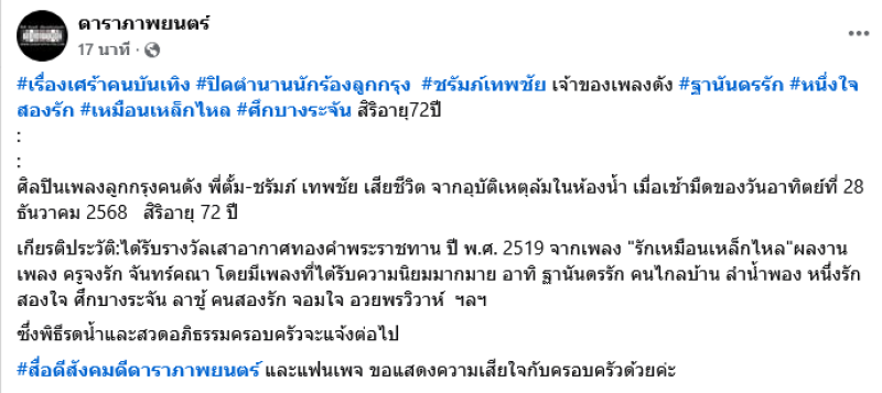 นับว่าเป็นอีกหนึ่งเรื่องเศร้าส่งท้ายปีของวงการเพลงเมื่อล่าสุดทางด้านเพจดาราภาพยนตร์ ได้ออกมาโพสต์แจ้งข่าวเศร้าโดยระบุว่า ศิลปินเพลงลูกกรุงคนดัง พี่ตั้ม ชรัมภ์ เทพชัย เสียชีวิต เมื่อเช้ามืดของวันอาทิตย์ที่ 28 ธันวาคม 2568 สิริอายุ 72 ปี