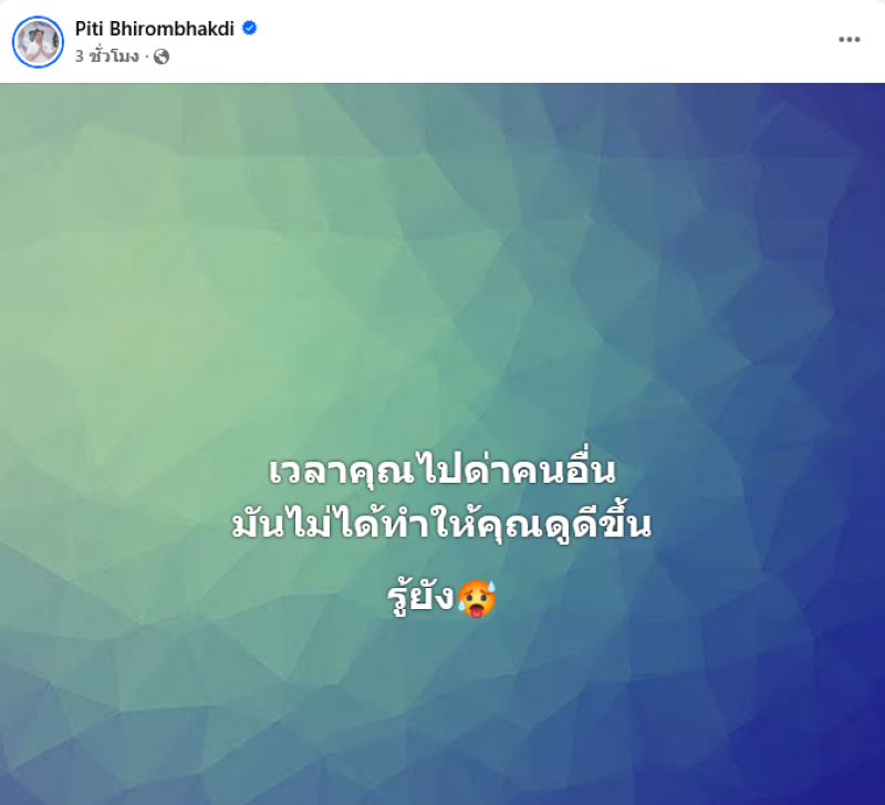 อย่าให้เงินมันเข้าตา จนลืมคำว่าถูกต้อง จำไว้ เราไม่ใช่คนเดียวที่มีเงินนะ น้องๆ ต่อมาได้โพสต์อีกว่า เวลาคุณไปด่าคนอื่น มันไม่ได้ทำให้คุณดูดีขึ้น รู้ยัง