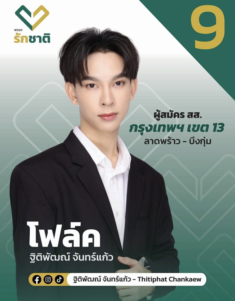 โดย ไฟล์ค ลงสมัครภายใต้สังกัด พรรครักชาติ ในพื้นที่กรุงเทพมหานคร เขต 13 พร้อมหมายเลขประจำตัวผู้สมัคร 9