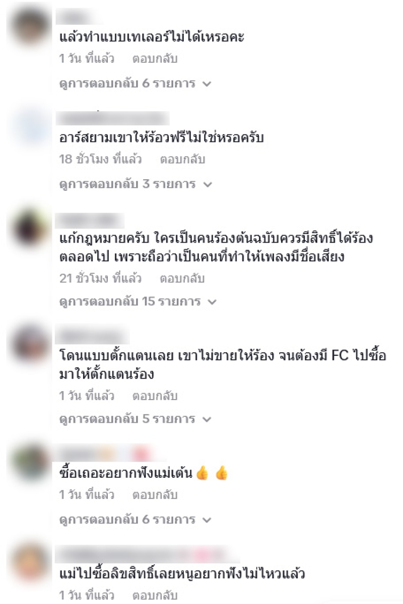 โดยมีแฟนๆ ขอให้ร้องเพลงดังๆ ในอดีต ซึ่งเป็นเพลงของค่ายเก่า อาทิ ตื๊ด, เปิดใจสาวแต, จ้างมันเต๊อะ ฯลฯ ที่ร้องได้ไม่เกิน 7 คำ พร้อมอธิบายสาเหตุว่า หลายคนถามว่าทำไมไม่ซื้อลิขสิทธิ์!? : หนูถามขอซื้อไปแล้วค่า แต่เค้าไม่ขาย แง้ (*ถ้างานที่มีการเก็บบัตรหรือมีการไลฟ์ คือ ร้องบ่ได้เน้อ)
